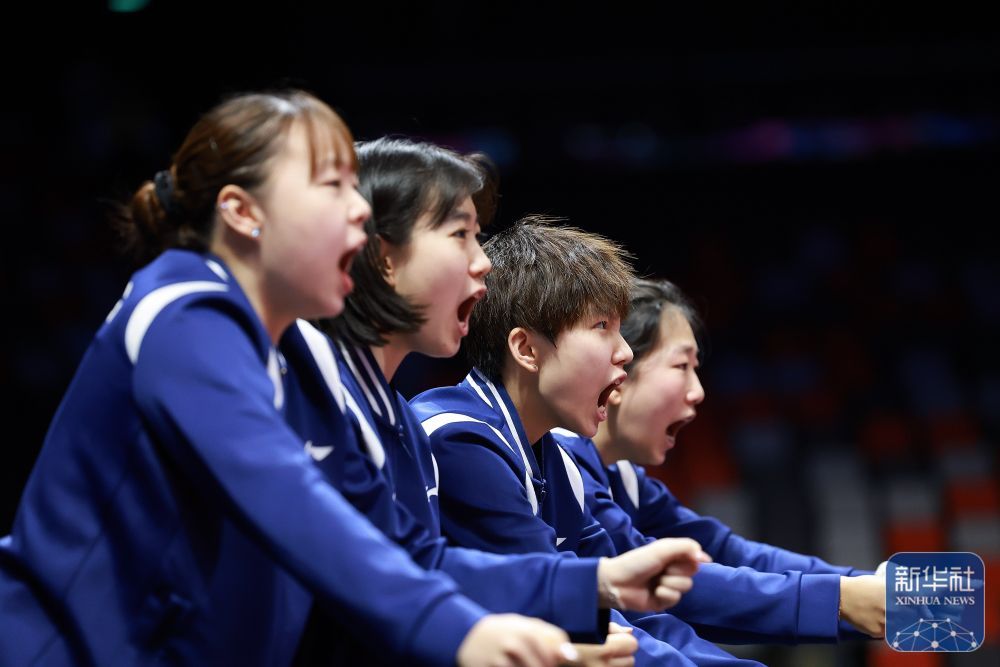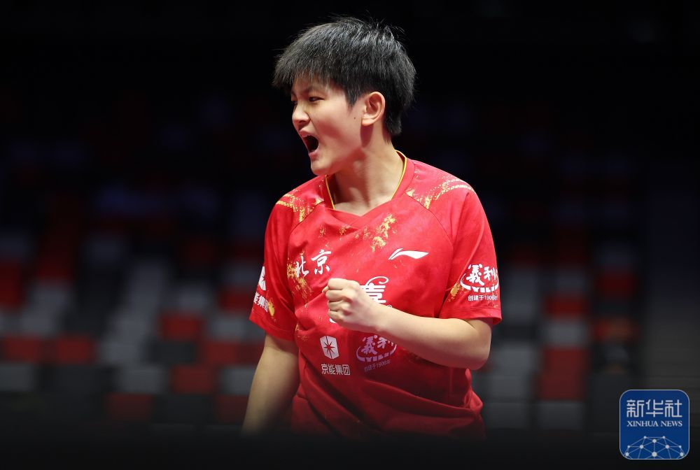 ↑ 北京隊選手祝啟慧在比賽中慶祝。她在單打比賽中3比1戰勝山東隊選手姜依依。 新華社記者 梁旭 攝
