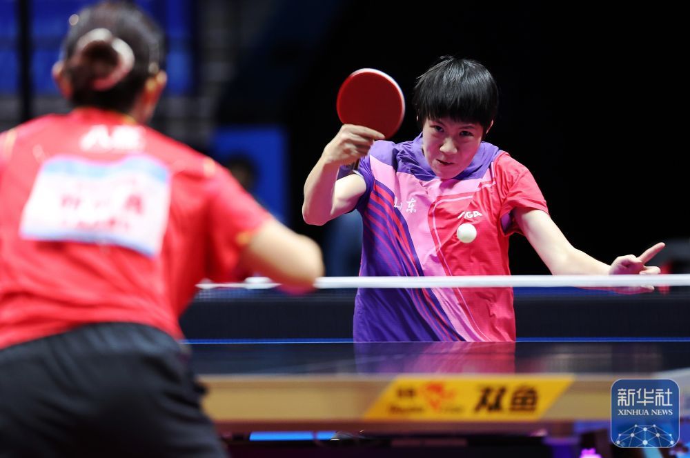 ↑ 山東隊選手丁怡婕(右)在比賽中回球。她在單打比賽中3比2戰勝北京隊選手劉昕冉。 新華社記者 陳斌 攝