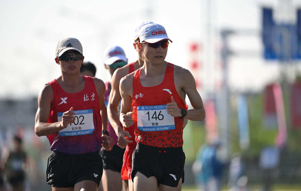 在12日進行的第十五屆全運會男子20公里競走決賽后半程,北京隊小將石升吉從大集團中加速,走在最前面。上屆全運會冠軍、云南隊張俊緊緊跟在他身后,兩人的差距始終沒有超過1秒。最后沖刺階段,張俊提速反超奪冠,石升吉以1秒之差位居第二。