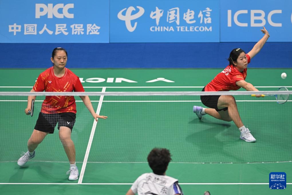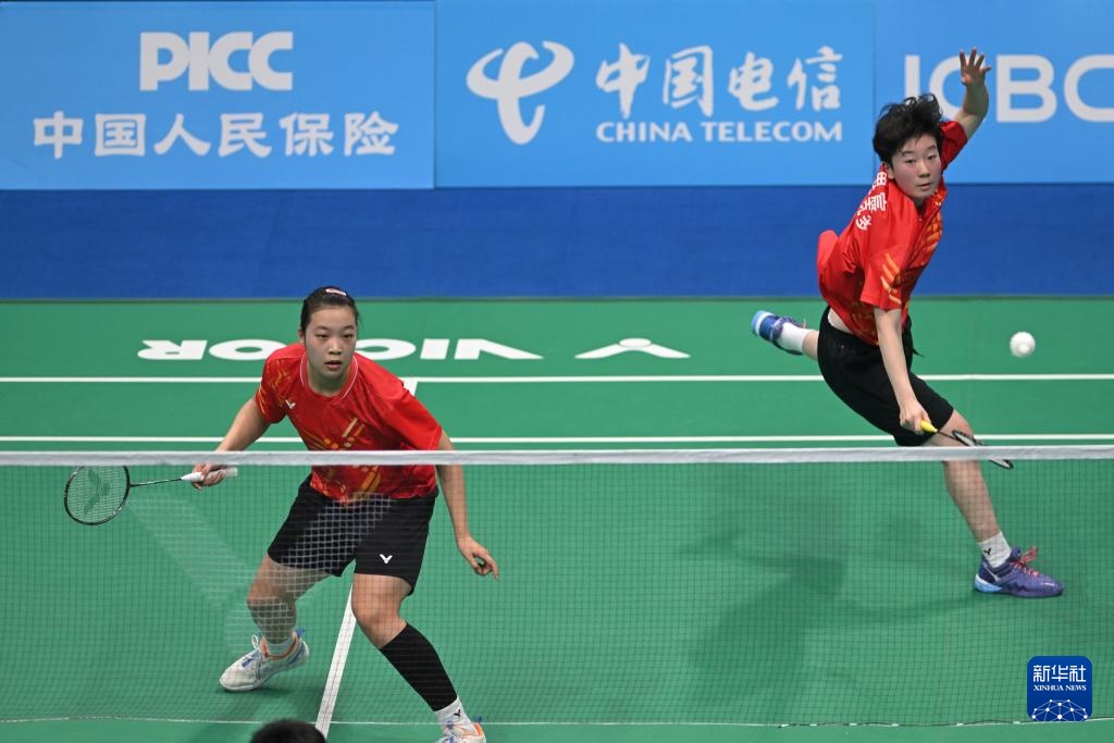 11月13日,江蘇隊組合秦添悅/史思宸(右)在女雙比賽中。她們2比1戰(zhàn)勝廣東隊組合魏玥玥/徐思怡。