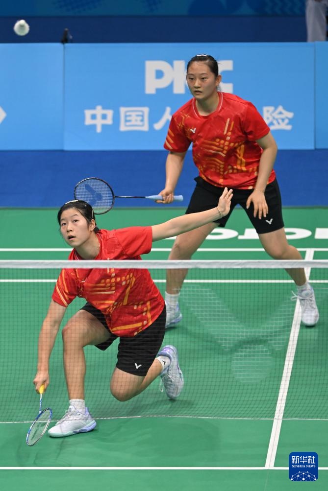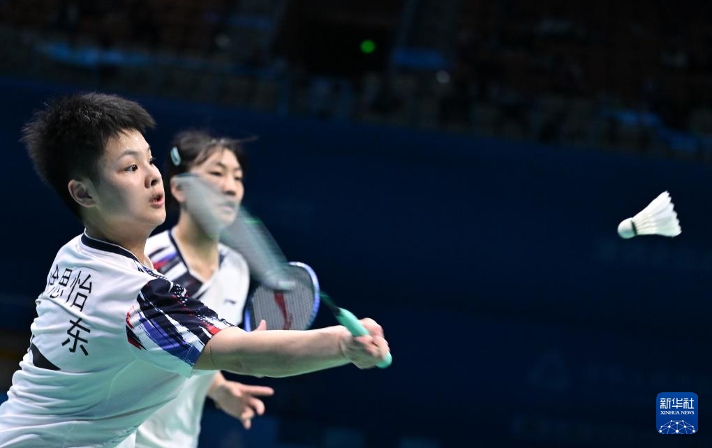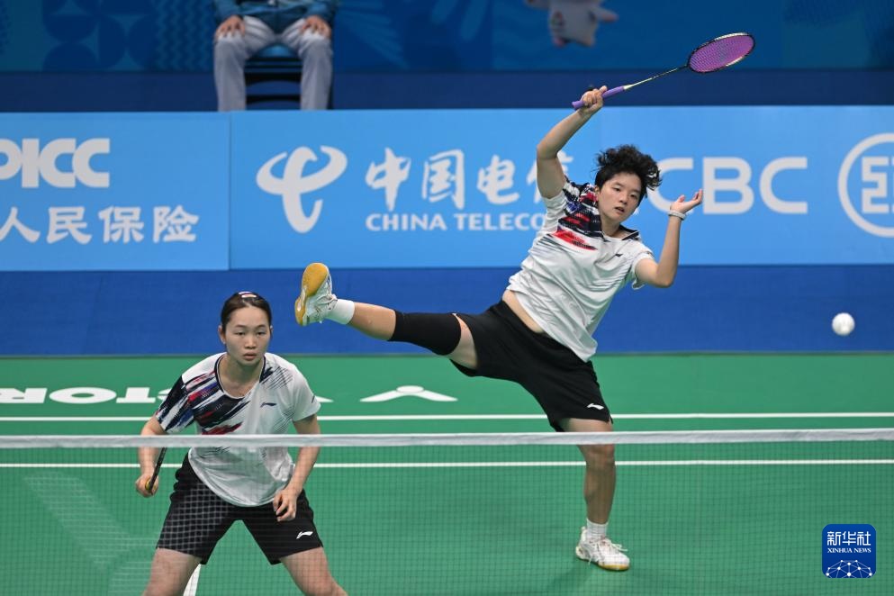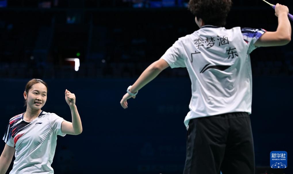 11月13日,廣東隊組合黃可欣(左)/李夢涵在女雙比賽中。她們2比0戰(zhàn)勝江蘇隊組合劉一諾/周慧嘉。