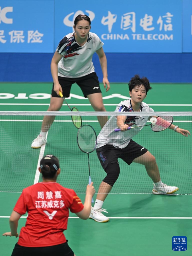 11月13日,江蘇隊組合秦添悅/史思宸(右)在女雙比賽中回球。她們2比1戰(zhàn)勝廣東隊組合魏玥玥/徐思怡。