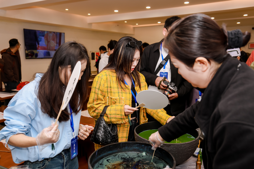 不遠處的漆扇體驗區同樣熱鬧。蘇學館研學課堂的張老師,正演示著漆扇制作的要領:“東坡赤壁的山水,染色要循序漸進,先以淡青鋪底,再加喜歡的色彩,輕輕一吹就能得到清逸韻味。”體驗結束時,大V們的手里都多了份“專屬作品”——有的捧著剛拓好的詩詞,有的拿著剛做好的漆扇,成為大家近距離觸摸東坡文化的“鑰匙”。