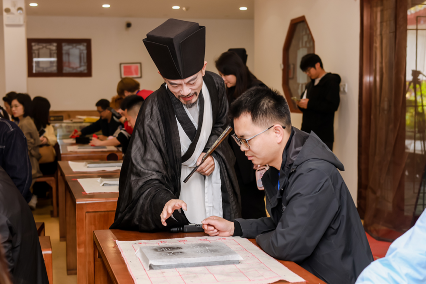 拓印體驗區,十余方復刻蘇軾詩詞的碑刻一字排開,蘇學館研學處王主任細心拆解著“鋪紙、刷平、捶打、上墨”的步驟:“這些碑刻復刻的,是蘇軾在黃州時期的手跡,拓印不只是復刻字跡,更是把千年文脈拓進心里。”現場大V們聽得格外認真,指尖沾著墨汁也不在意,反復跟著練習上墨技巧。來自安徽的大V張巖成功拓出《記承天寺夜游》時,感慨“我非常喜歡懷民亦未寢的心境,親手拓印的瞬間仿佛與蘇軾隔空對話,非遺手藝里藏著荊楚文脈的密碼。”