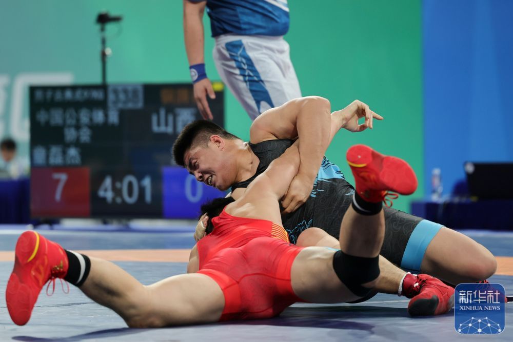 ↑ 中國公安體育協(xié)會隊選手童磊杰與山西隊選手劉肖飛(右)在銅牌賽中。