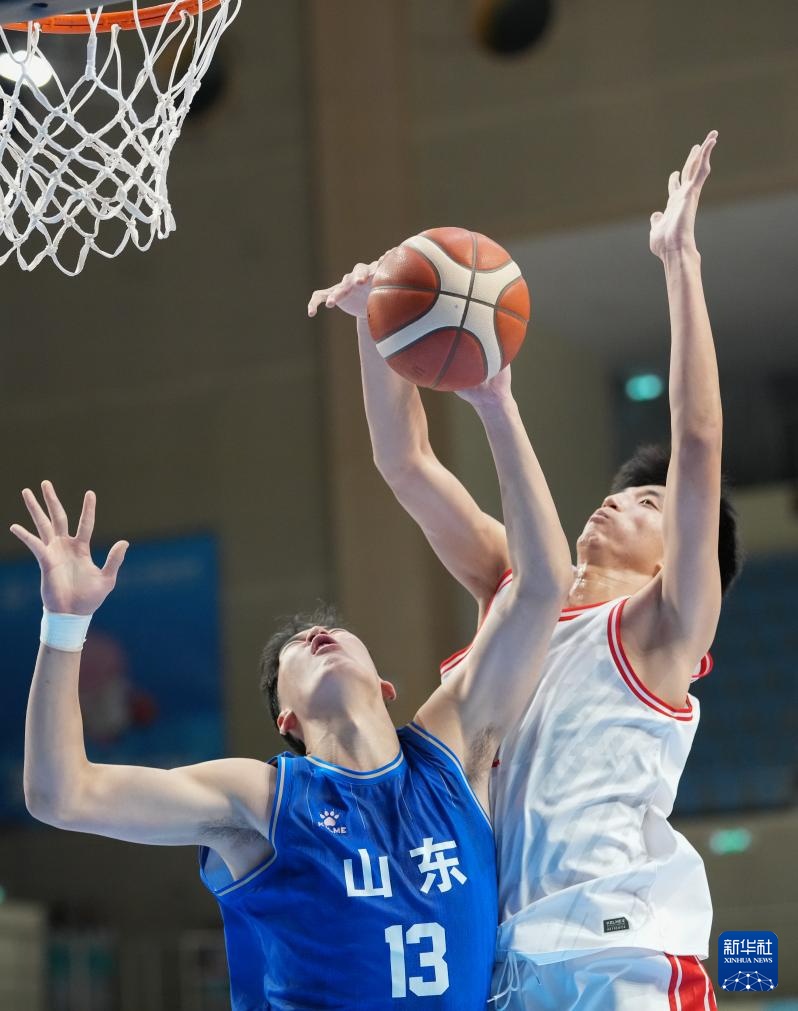 11月13日,山東隊球員趙浩然(左)與河北隊球員劉家行在比賽中爭搶籃板球。