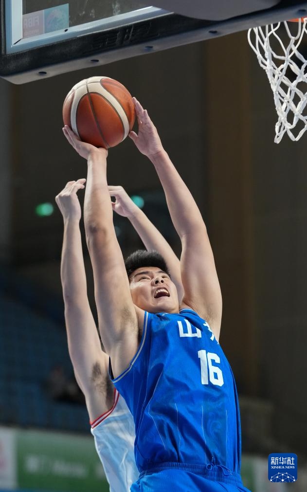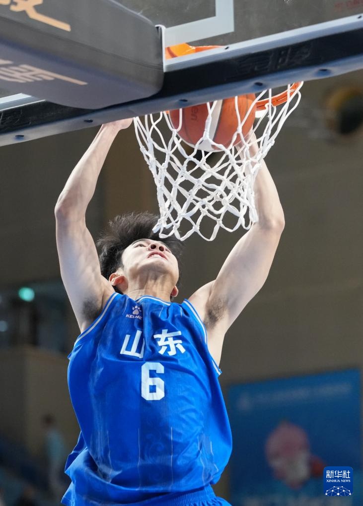 11月13日,山東隊球員張博源在比賽中扣籃。