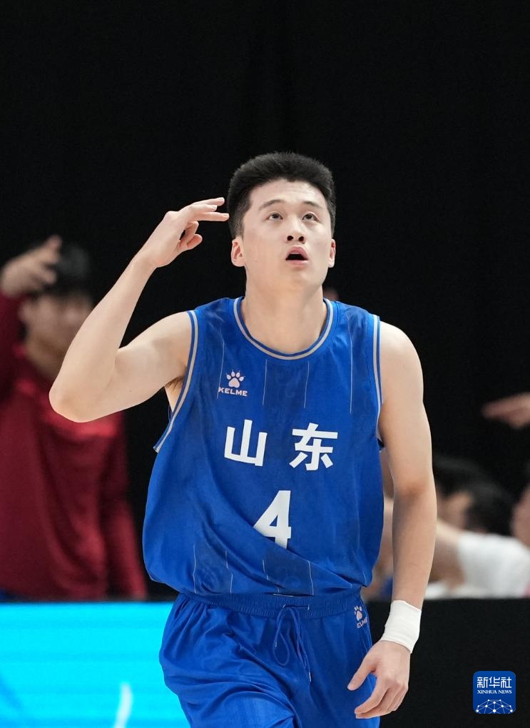 11月13日,山東隊球員王凱在投入一記三分球后慶祝。