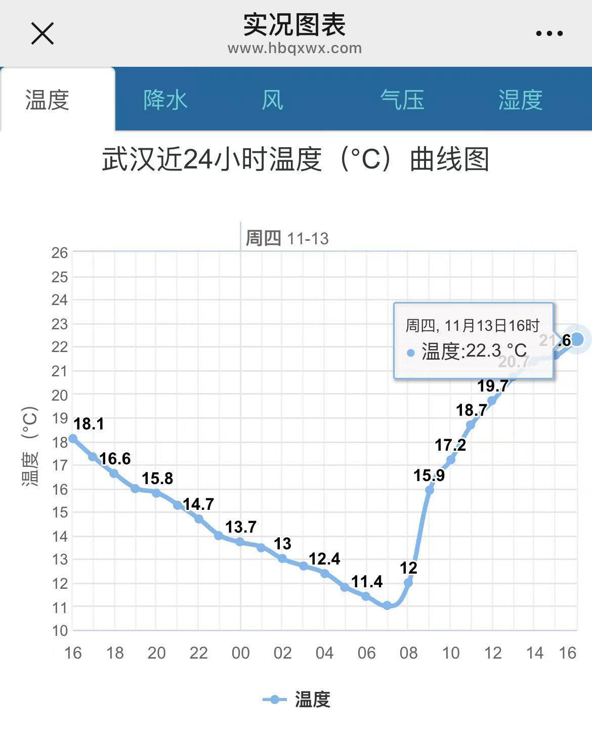 武漢一直到本周末都是暖秋在線,周五至周日最高氣溫分別為22℃、23℃和23℃。不過,16日(周日)夜間到下周一,強冷空氣導演大風降溫,局地有弱降水,最高氣溫將下降10℃左右,下周二武漢最低氣溫為0℃,從20℃+跌至0℃,只要一兩天的時間,這氣溫下降就像“自由落體”。