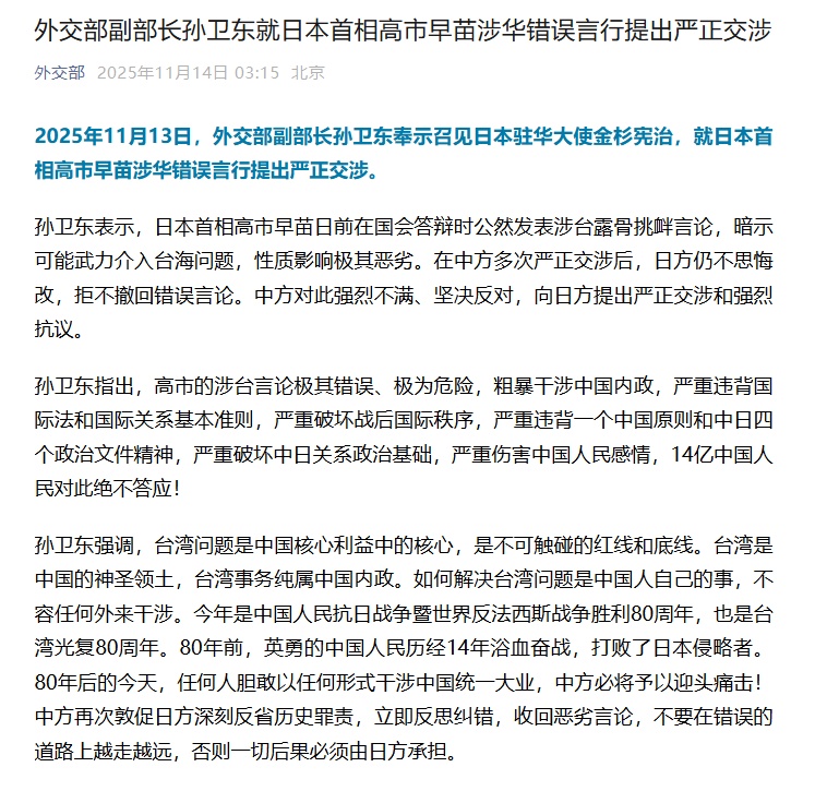 2025年11月13日,外交部副部長孫衛東奉示召見日本駐華大使金杉憲治,就日本首相高市早苗涉華錯誤言行提出嚴正交涉。