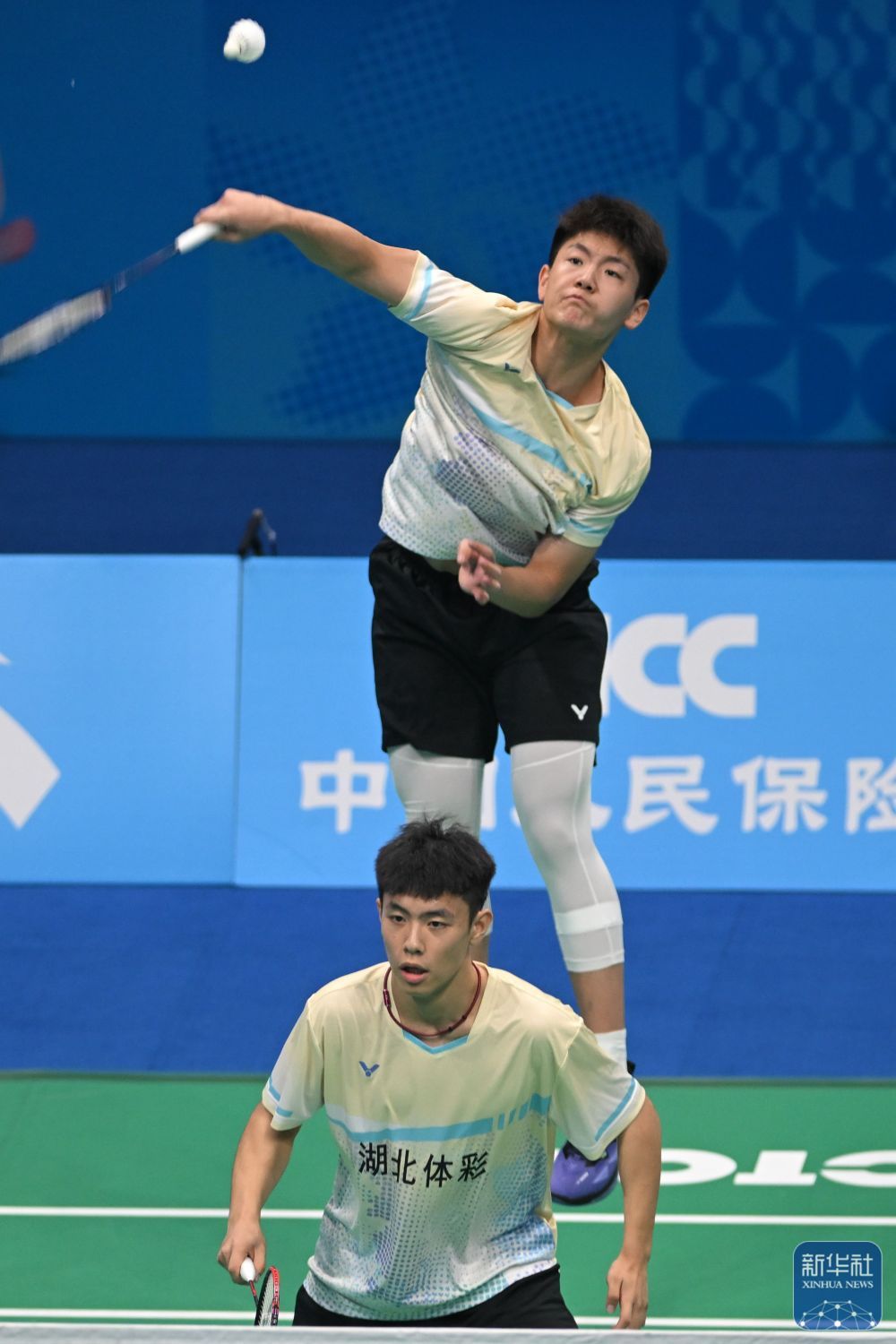 ↑ 湖北隊組合屠懿宸(上)/鄭惟罡在男雙比賽中回球。 新華社記者 張龍 攝