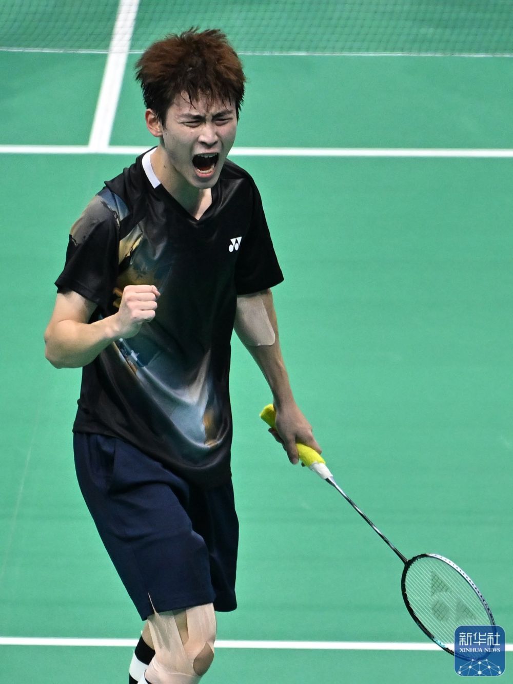 ↑ 山東隊選手肖高博在男單比賽中慶祝。 新華社記者 李賀 攝