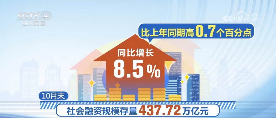 央視網消息:11月13日,中國人民銀行發布10月金融數據。10月,社會融資規模增速保持在較高水平,持續為經濟回升向好創造適宜的貨幣金融環境。
