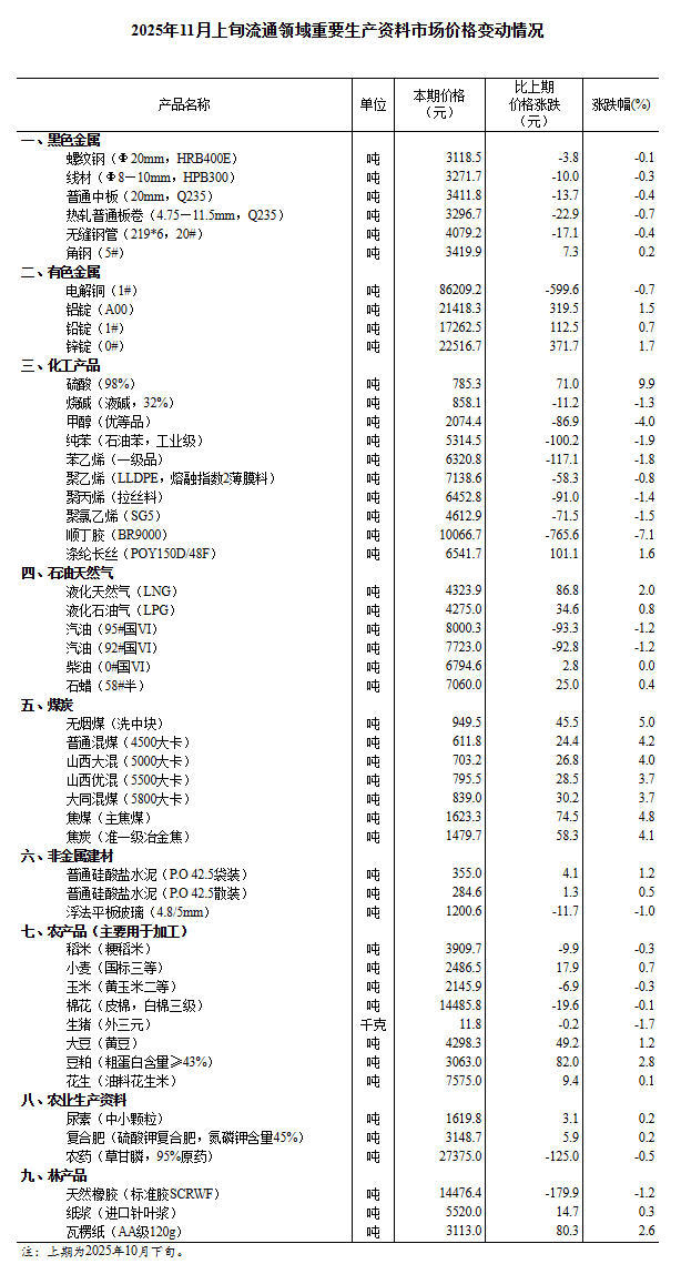 據對全國流通領域9大類50種重要生產資料市場價格的監測顯示,2025年11月上旬與10月下旬相比,26種產品價格上漲,23種下降,1種持平。