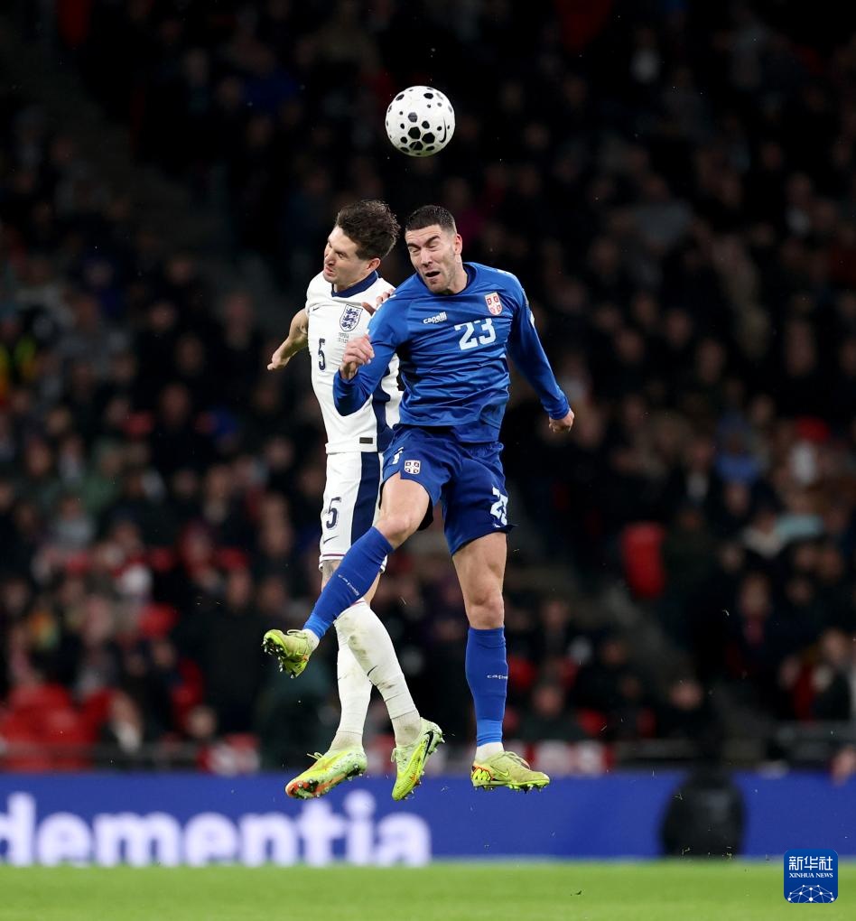 11月13日,英格蘭隊球員斯通斯(左)與塞爾維亞隊球員弗拉霍維奇在比賽中爭頂。