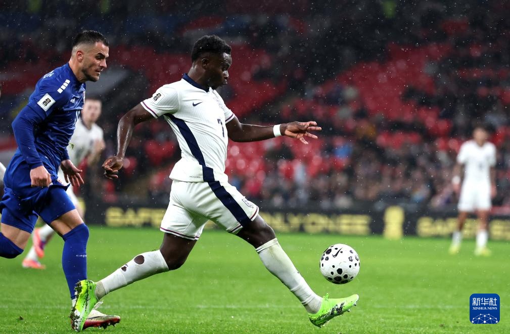 11月13日,英格蘭隊球員薩卡(右)在比賽中帶球突破。