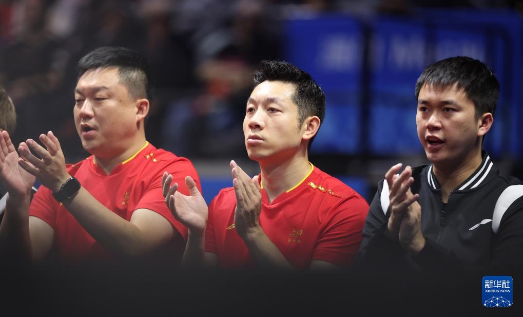 11月14日,上海隊選手許昕(中)在比賽中為場上隊友加油。