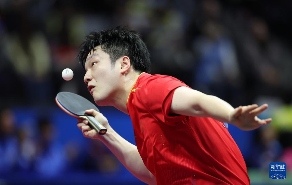 11月14日,上海隊選手樊振東在比賽中回球。他在單打比賽中對陣江蘇隊選手孫聞。