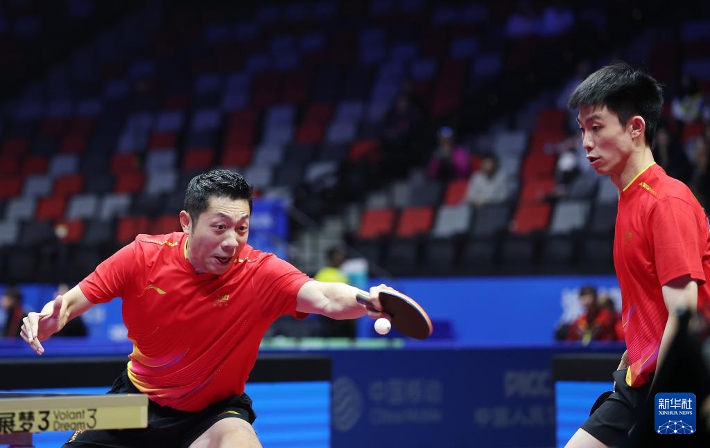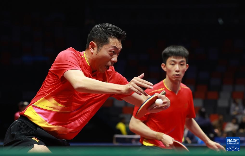 11月14日,上海隊組合周愷/許昕(左)在比賽中。他們在雙打比賽中3比1戰勝江蘇隊組合曹彥濤/陳亞軒。