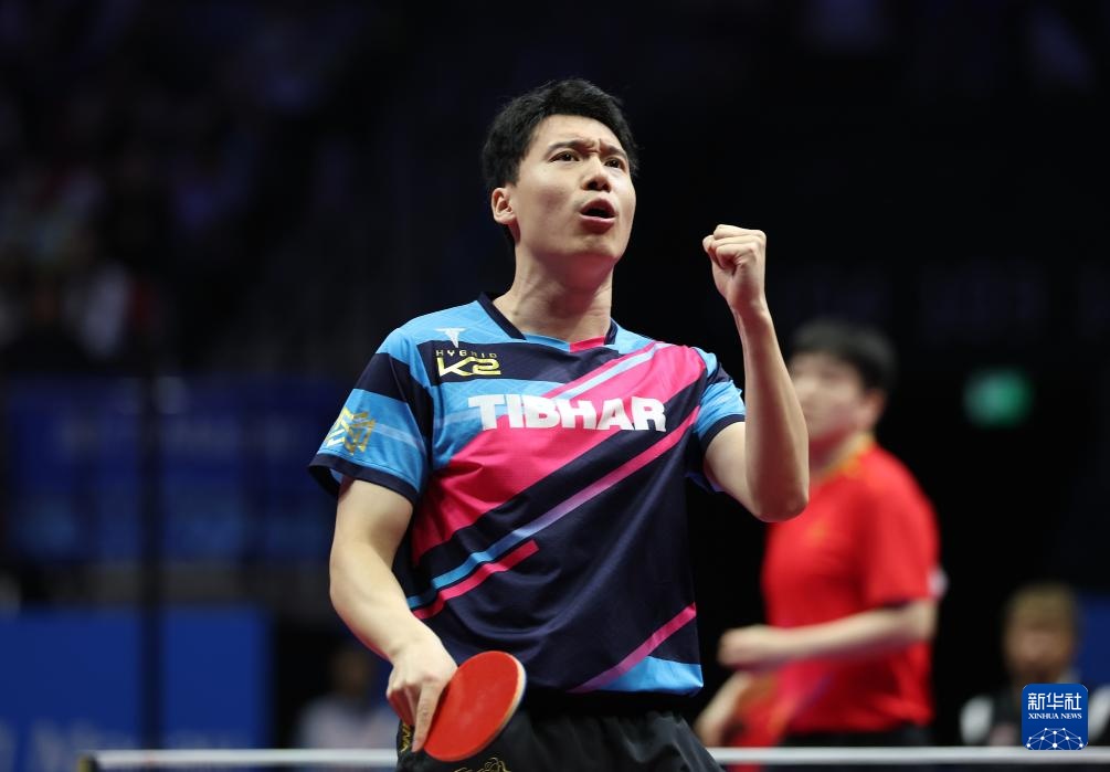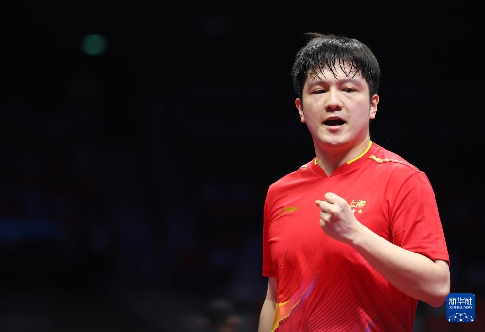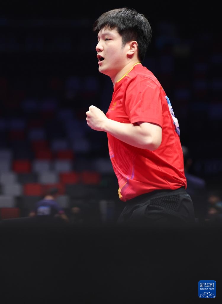 11月14日,上海隊選手樊振東在比賽中慶祝得分。