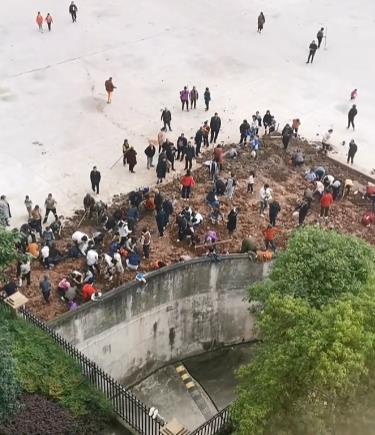 現場視頻顯示,一處廣場旁的泥地上擠滿人群,不少人拿著鋤頭在刨地。