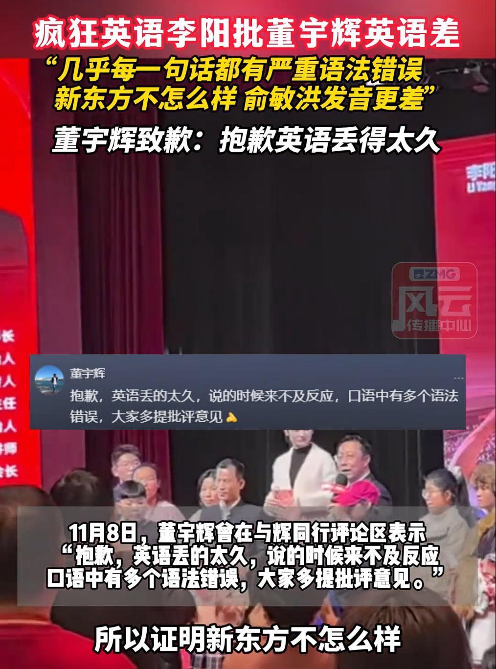 11月10日,有網友發視頻,瘋狂英語線下活動中,創始人李陽表示:“昨天我聽了董宇輝的演講,跟國外的外交官交流,幾乎每一句話都有嚴重的語法錯誤,而且發音特別怪,所以證明新東方不怎么樣,俞敏洪發音更差,所以學口語唯有瘋狂英語。這段話一定要發到網上,引起洪天巨浪,軒然大波,我就喜歡軒然大波。”11月8日,董宇輝曾在“與輝同行”評論區表示:“抱歉,英語丟得太久,說的時候來不及反應,口語中有多個語法錯誤,大家多提批評意見。”(據11月14日縱覽新聞)