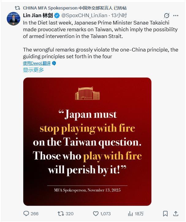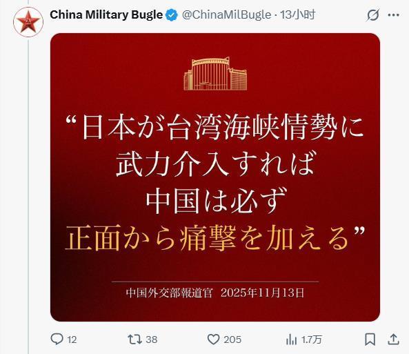 11月13日,中國軍號、中國外交部在海外社交媒體平臺上用日語發文:如日方膽敢武力介入臺海局勢,中方必將迎頭痛擊!