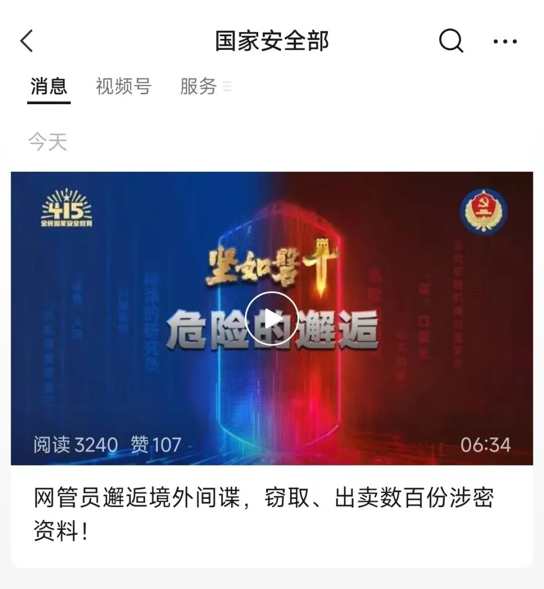 近期,國家安全機關破獲一起針對我軍工領域、重點部位的間諜案件,我國某軍工集團下屬研究院工作人員兼網絡管理員、保密員衛某,被抓捕歸案。