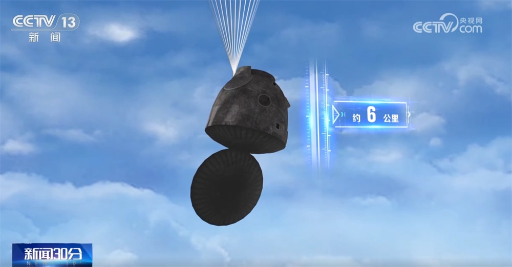 返回艙繼續下降到10公里高度時,要執行第三步關鍵動作——開傘。開傘的過程是三級開傘,引導傘、減速傘、主傘。1200平方米的主傘打開后,返回艙下降速度降低到每秒7至8米。到大約6公里高度時,返回艙將防熱大底拋掉。
