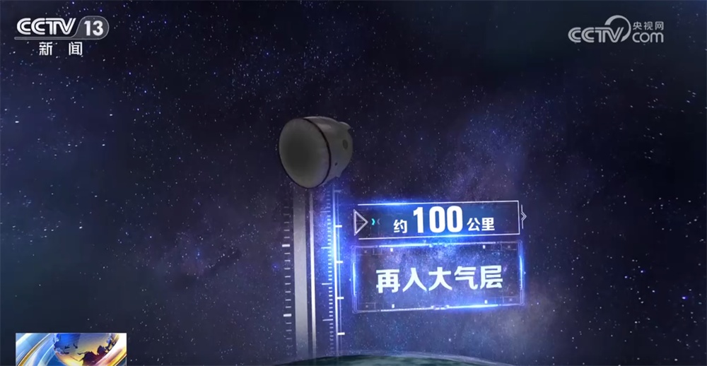 在距離地面約145公里時,推進艙和返回艙分離。大約在120公里高度,進行配平攻角調整。在距離地面大約100公里高度時,返回艙沖進大氣層。由于和大氣發生劇烈摩擦,返回艙如同一個火球在天際劃過,在大約80至40公里高度,返回艙外面會形成一個等離子殼,導致地面與返回艙之間的無線電通信中斷,這個階段也被稱為“黑障區”。