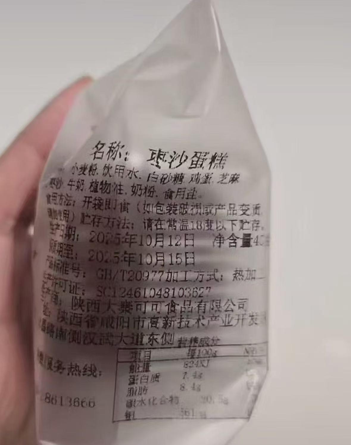 根據網友發布的圖片,涉事食品是一款“棗沙蛋糕”,包裝袋顯示生產日期為“2025年10月12日”,保質期至“2025年10月15日”。發布視頻的網友表示,有學生吃完該款加餐蛋糕之后出現“上吐下瀉”的癥狀。