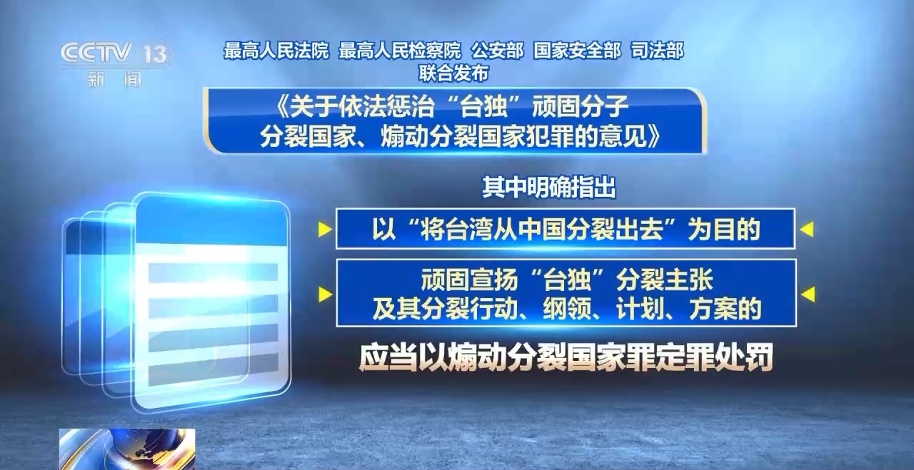 2024年6月,最高人民法院、最高人民檢察院、公安部、國家安全部、司法部聯(lián)合發(fā)布關于依法懲治“臺獨”頑固分子分裂國家、煽動分裂國家犯罪的意見,對煽動分裂國家罪的具體情形作出明確規(guī)定。其中明確指出:以“將臺灣從中國分裂出去”為目的,頑固宣揚“臺獨”分裂主張及其分裂行動、綱領、計劃、方案的,應當以煽動分裂國家罪定罪處罰。