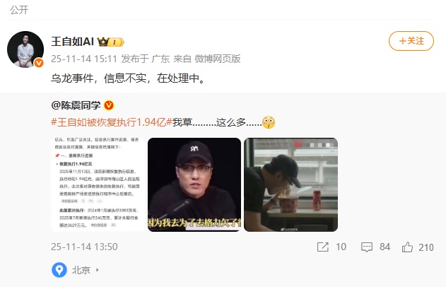 11月14日,王自如發文辟謠被恢復執行1.94億元。
