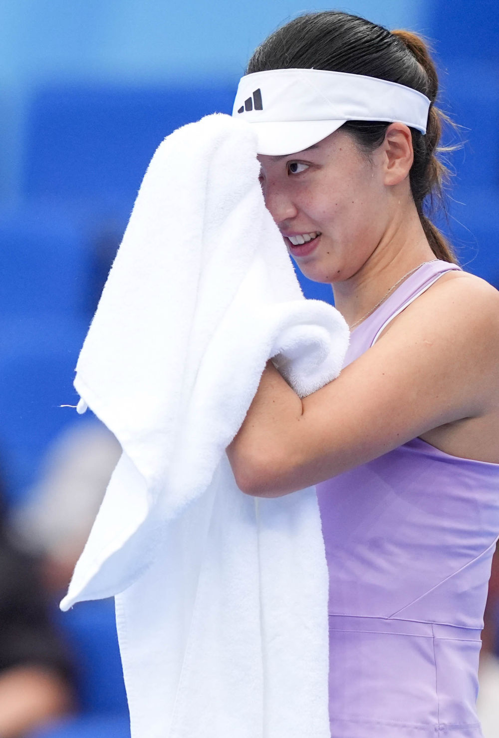 ↑ 廣東隊選手王欣瑜在比賽間歇用毛巾擦汗。最終,她2比0戰(zhàn)勝福建隊選手王育萍,晉級下一輪。