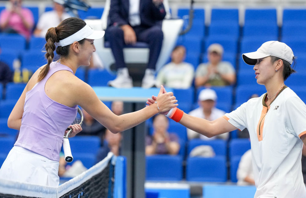 ↑ 廣東隊選手王欣瑜(左)與福建隊選手王育萍在比賽后握手致意。