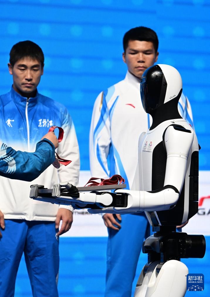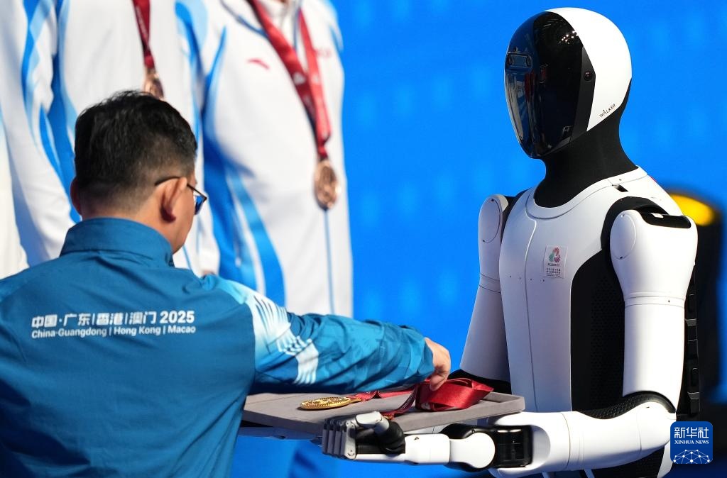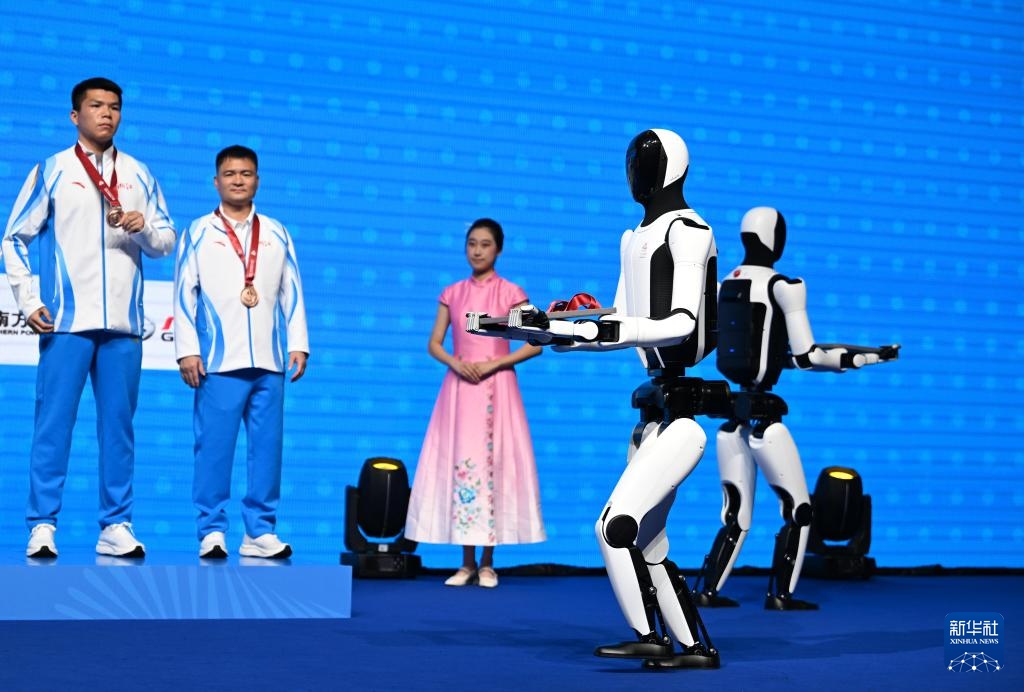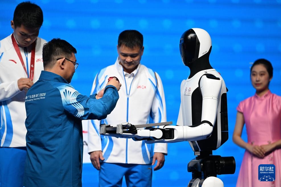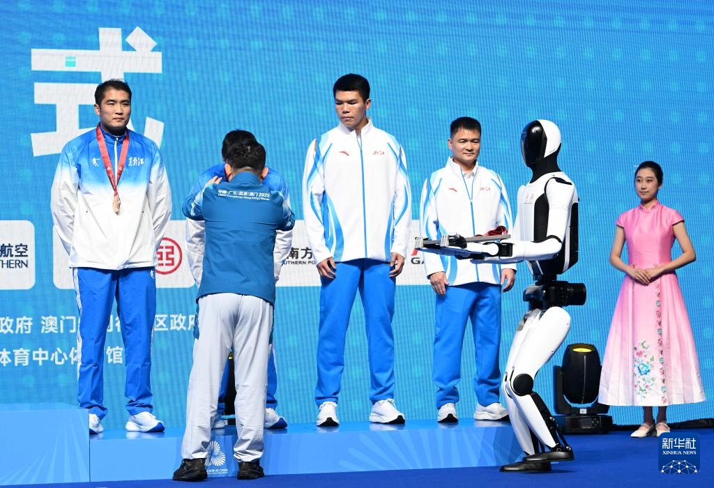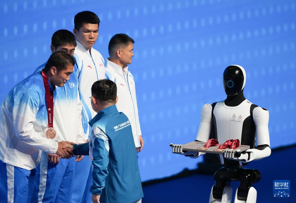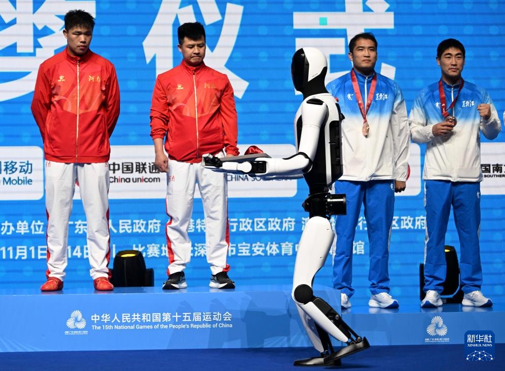 當日,人形機器人亮相第十五屆全國運動會拳擊男子92公斤級頒獎儀式。