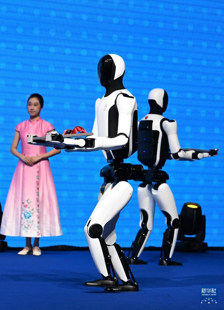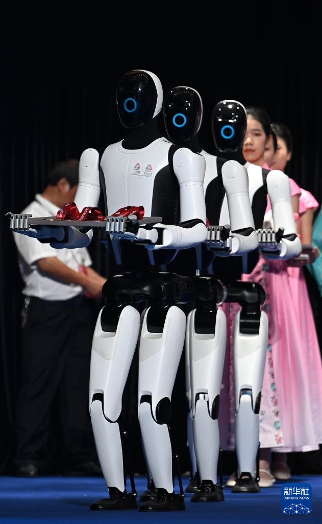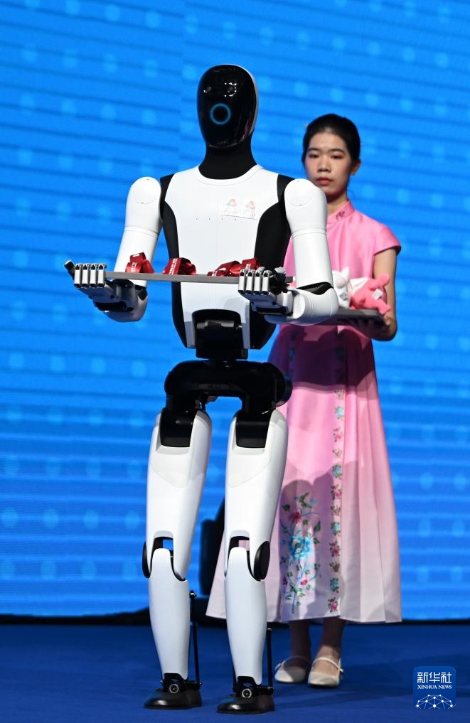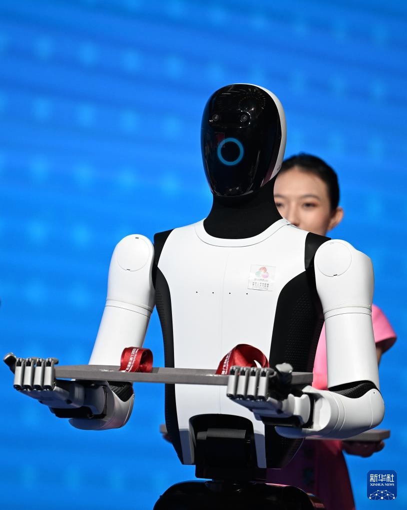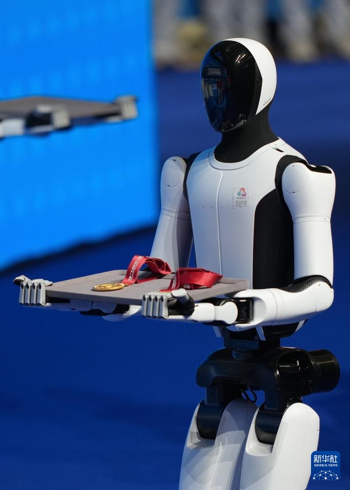 11月14日,人形機器人在頒獎儀式上為頒獎嘉賓遞上獎牌。