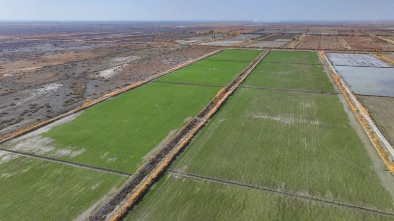 二二三團地處天山南坡,土壤表層鹽殼最深可達40—50厘米,平均厚度20厘米,含鹽量一度高達千分之二十四。2022年,當地與袁隆平青島海水稻研發團隊合作,啟動系統化治理。