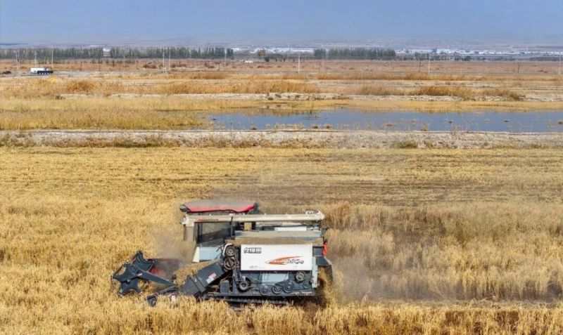 大馬力收割機來回穿梭收割水稻。圖/鐵門關在線微信公眾號