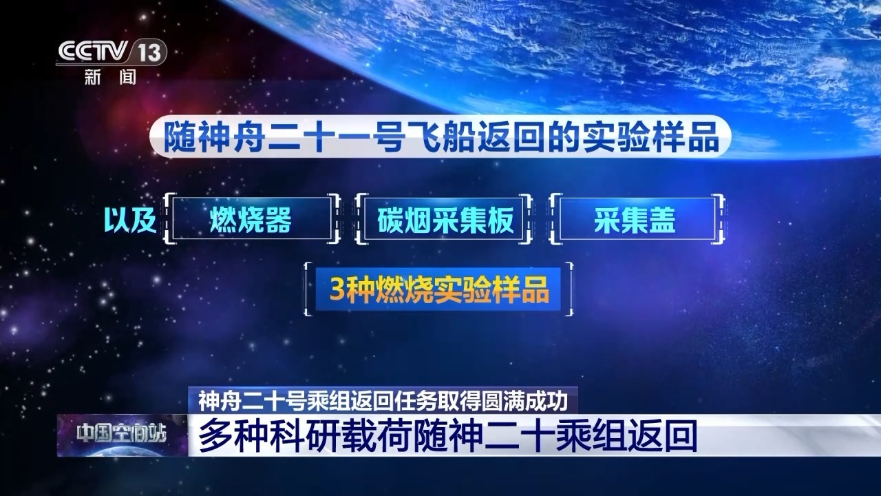 隨神舟二十一號飛船返回的實驗樣品包括實驗小鼠、斑馬魚和金魚藻、巨噬細胞、肝細胞等9種生命實驗樣品;另外有鎢鉿合金、軟磁材料、水合鹽相變和模擬月壤、抗輻照光纖、新型熱控涂層、空間薄膜太陽電池防護等多種材料樣品,以及燃燒器、碳煙采集板及采集蓋3種燃燒實驗樣品。