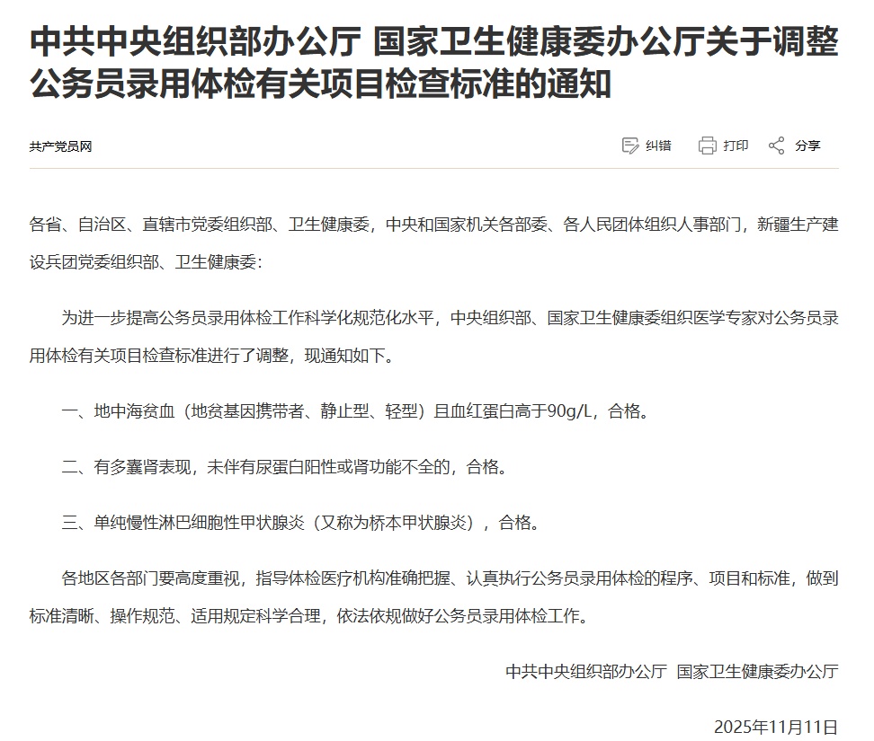 據共產黨員網11月14日披露,近日,為進一步提高公務員錄用體檢工作科學化規范化水平,中央組織部、國家衛生健康委組織醫學專家對公務員錄用體檢有關項目檢查標準進行了調整。