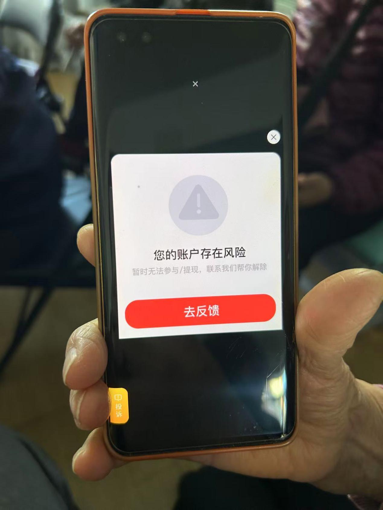 記者借用馬女士的手機試了試,如果不慎點擊到這個紅包按鈕,網頁就會進行層層跳轉,想攔都攔不住。最后,頁面總是會出現一個安全提示,上邊寫著:“您的賬戶存在風險,暫時無法參與/提現,聯系我們幫您解除”,下方則是一個“去反饋”按鈕。由于擔心點擊之后會中木馬病毒或是泄露信息,記者并未往下操作,馬女士也表示,這個安全提示是第一次見,之前沒遇到過。