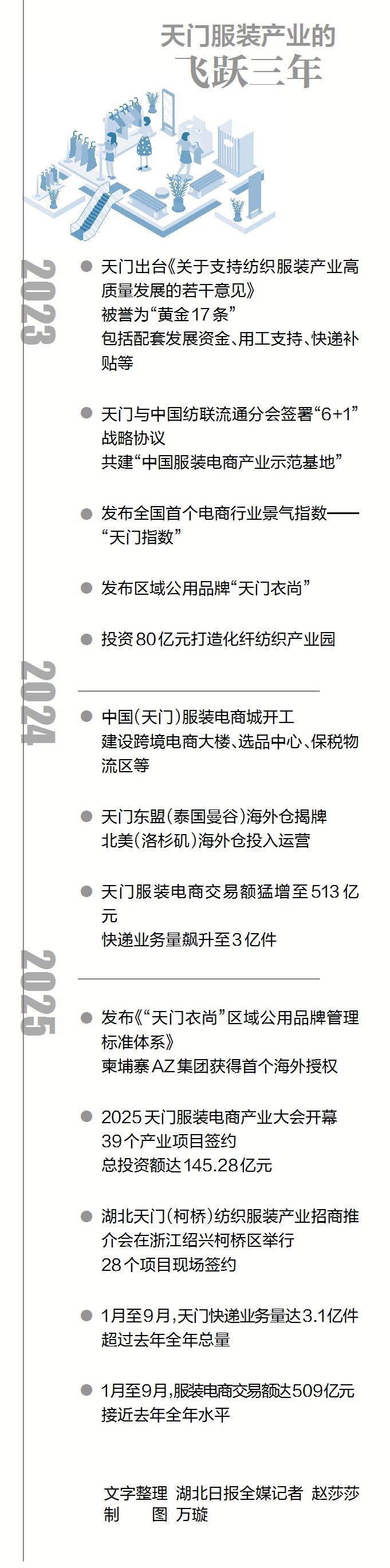 根據規劃,到2030年,天門將培育10家年銷售額超30億元的自主品牌企業,建成六大核心海外倉,實現“7天全球達”的物流目標。屆時,天門服裝電商交易額將突破1000億元。