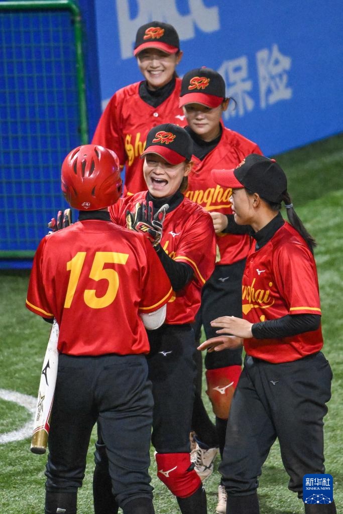 11月14日,上海隊球員祝賀隊友王蓓(前左)安打得分。