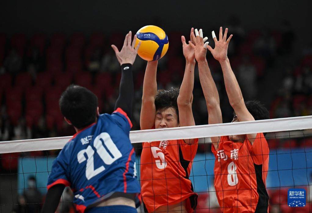 11月14日,河南隊球員冀宇浩(左)在比賽中扣球。