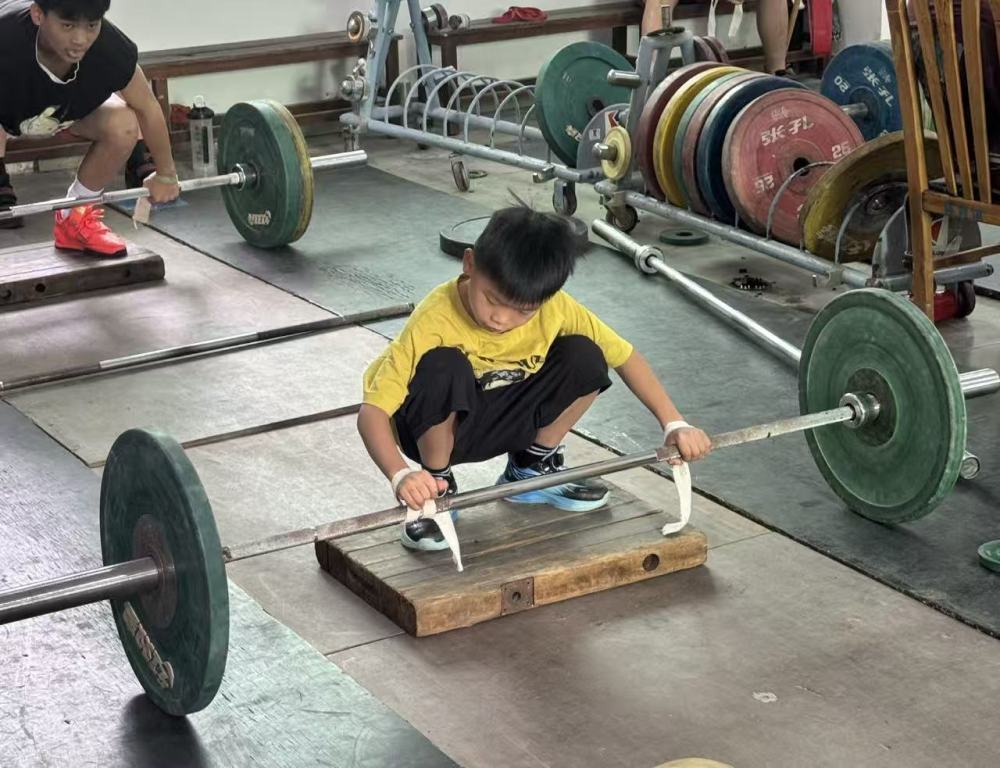 10歲的徐鑫駿,好像就有何教練曾經的影子。同樣來自湖南的他,是體校里年齡最小的學員之一。體重只有23公斤的他,接受采訪時坐在凳子上腳都夠不到地面,硬拉卻可以達到兩倍體重。