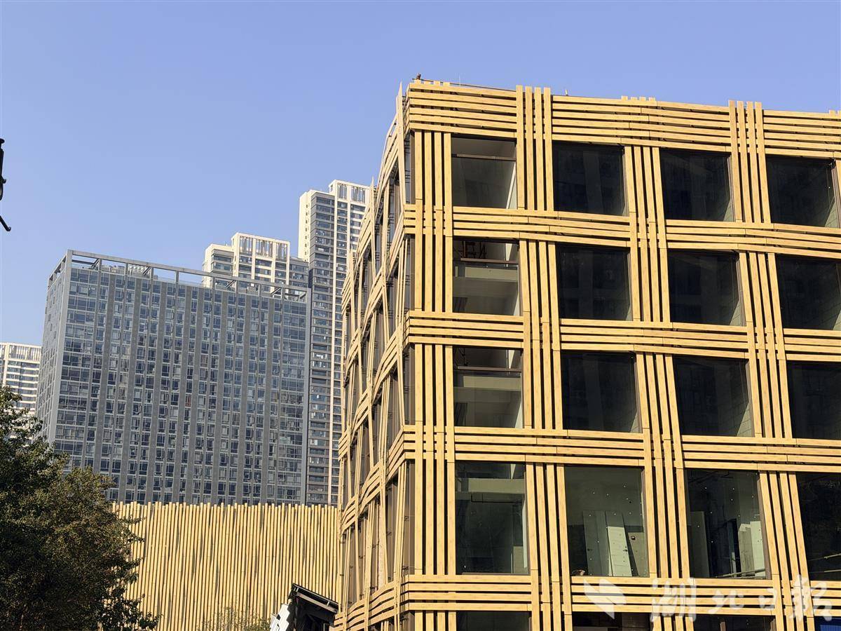 建設中的AC歐軒酒店與已投入使用的開心麻花劇場都采用“竹編”設計。(湖北日報全媒記者 楊文漪 攝)