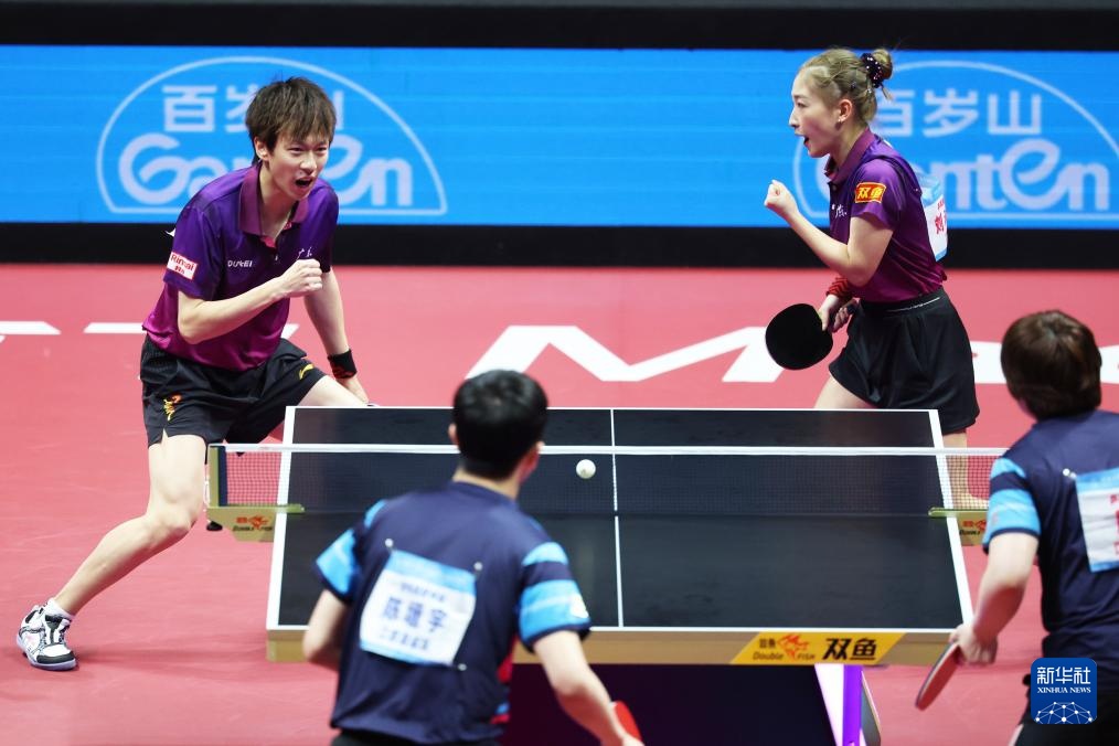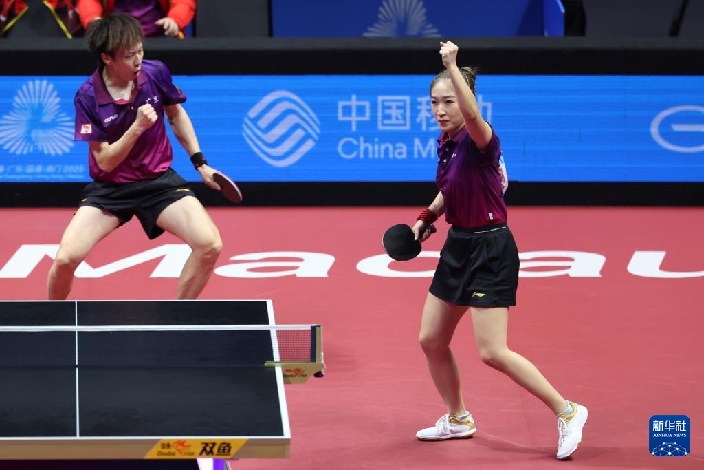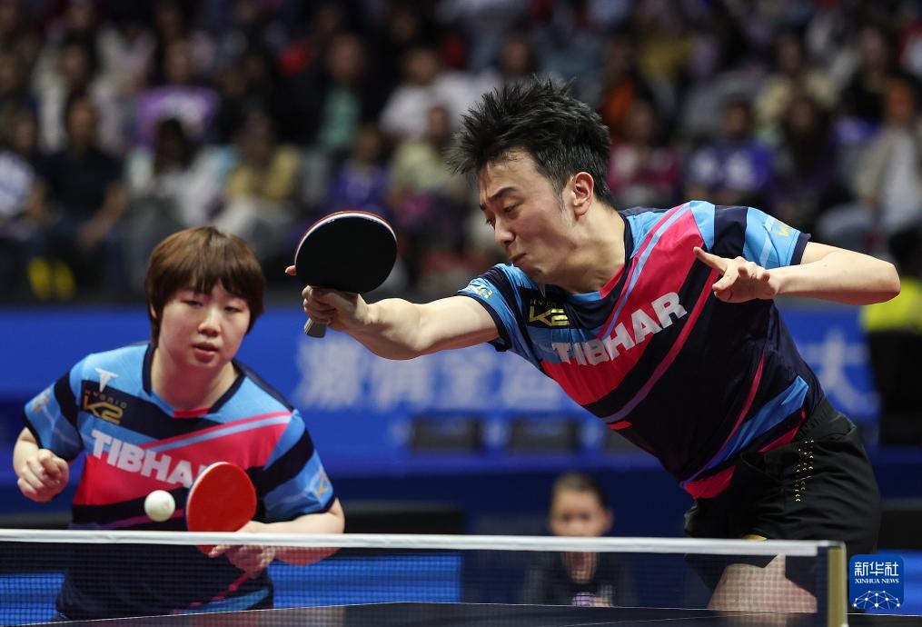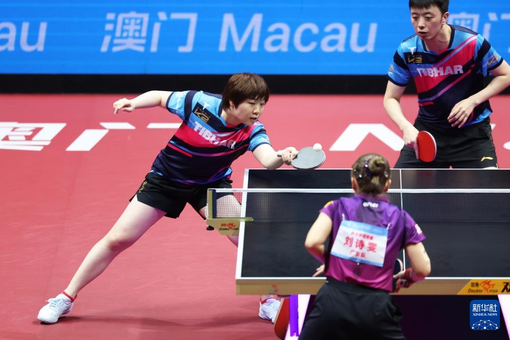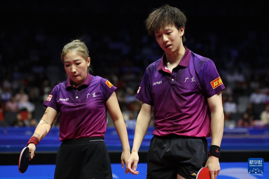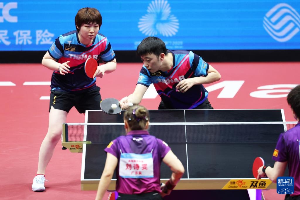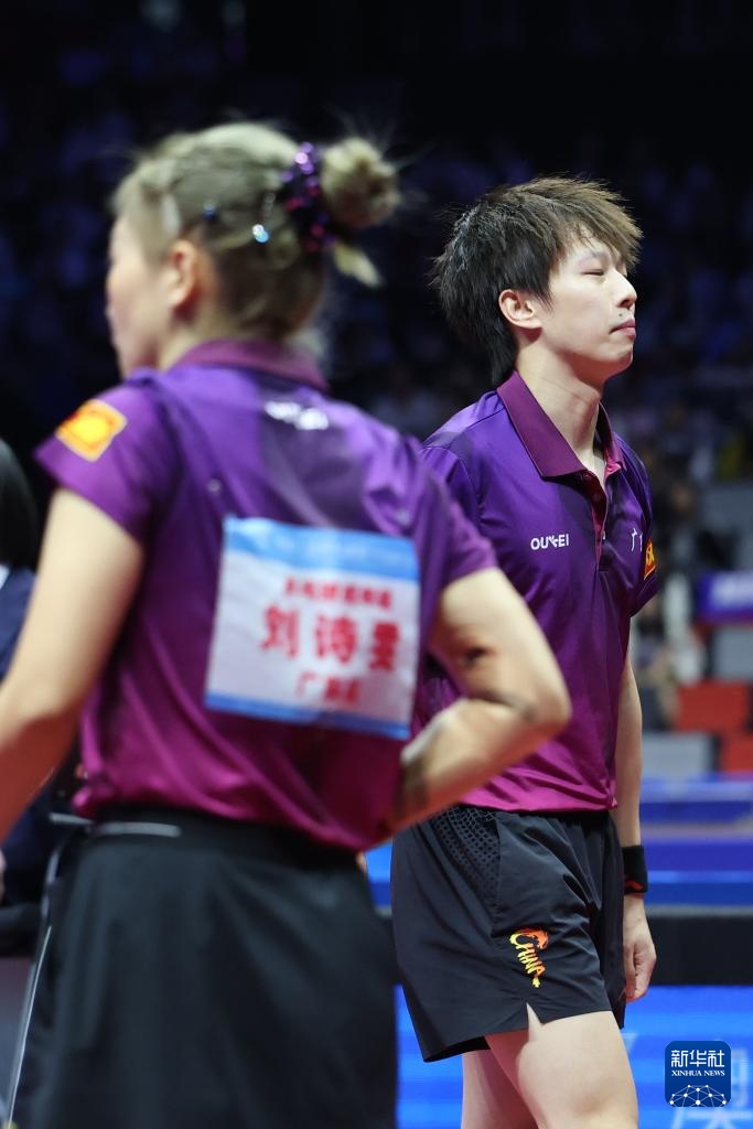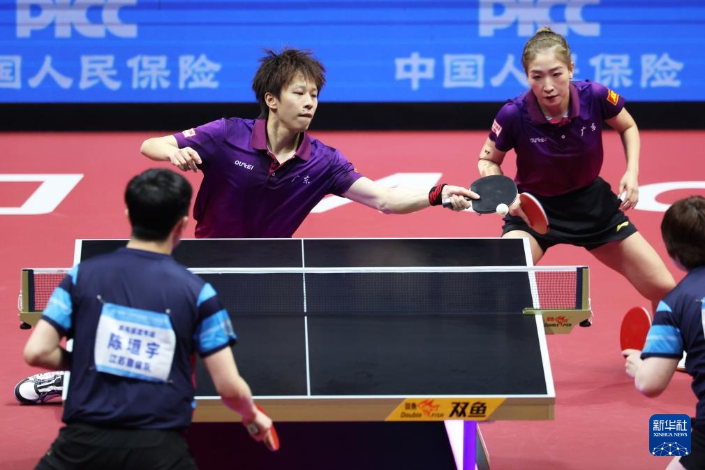 11月14日,廣東隊組合林高遠(右)/劉詩雯在比賽中回球。
