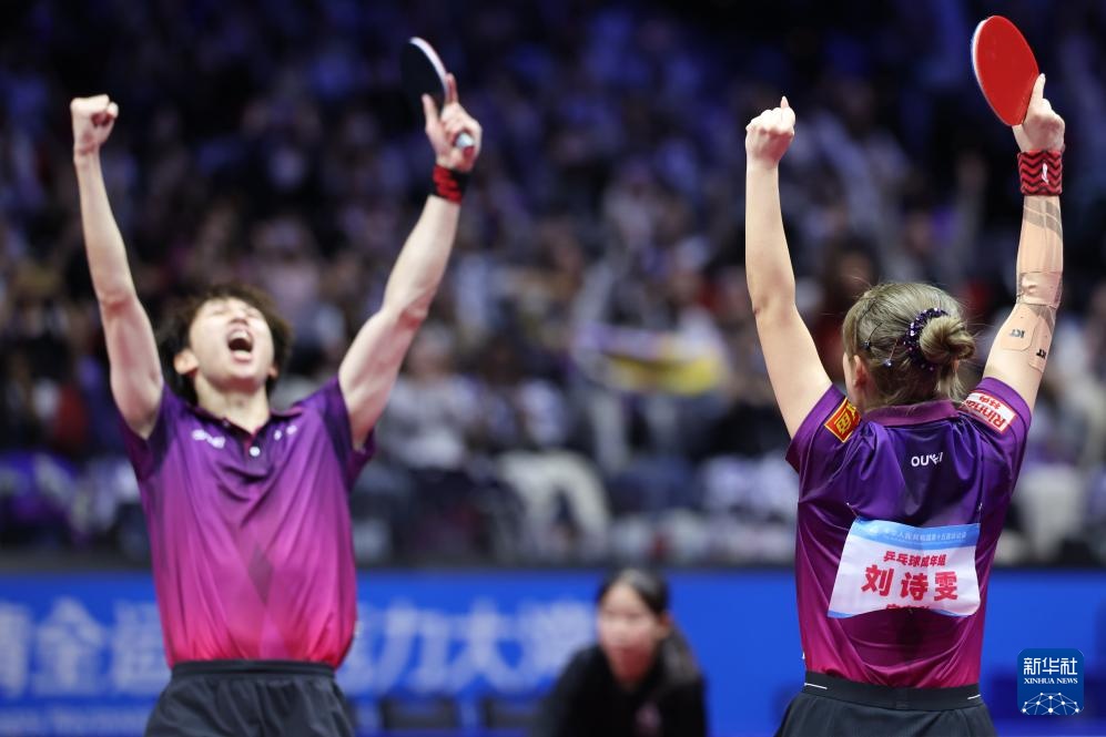 11月14日,廣東隊組合林高遠/劉詩雯(右)慶祝奪冠。