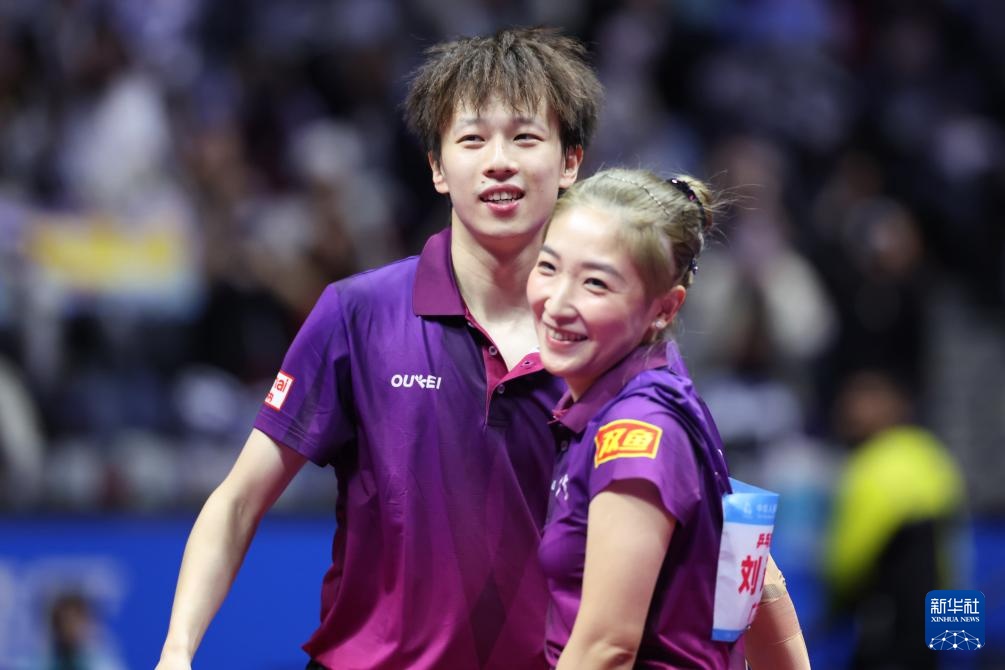 11月14日,廣東隊組合林高遠/劉詩雯(上)在比賽后慶祝奪冠。